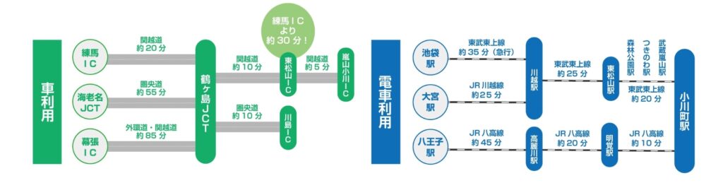 車で関越自動車道東松山または嵐山小川インターチェンジ、圏央道の川島インターチェンジ利用。